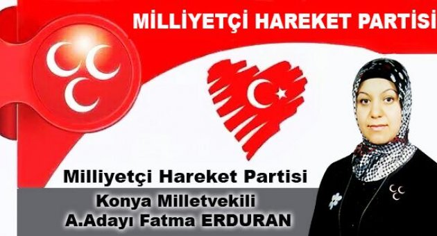 KONYA ÇELTİK İLÇESİ SAKİNLERİNDEN LİSE MEZUNU 3 ÇOCUK ANNESİ EV HANIMI 33 YAŞINDAKİ FATMA ERDURAN MHP KONYA MİLLET VEKİLİ A.ADAYI OLDU. EV HANIMLARININ TBMM DEKİ SESİ VE EZİLEN DÖVÜLEN KESİLİP ÇÖPE ATILAN KIZLARIN KADINLARIN SAVUNUCUSU OLMAK İÇİN ADAYIM DEDİ